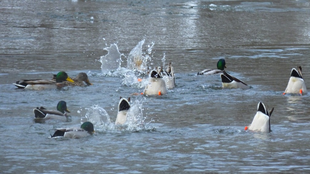 Above the falls, I could only see mallards today, and this bunch had found a spot to graze that was perhaps a little deeper than usual, but not deep enough to dive for. Thus, they had to generate quite a bit more splash with their feet than usual to reach the good stuff.