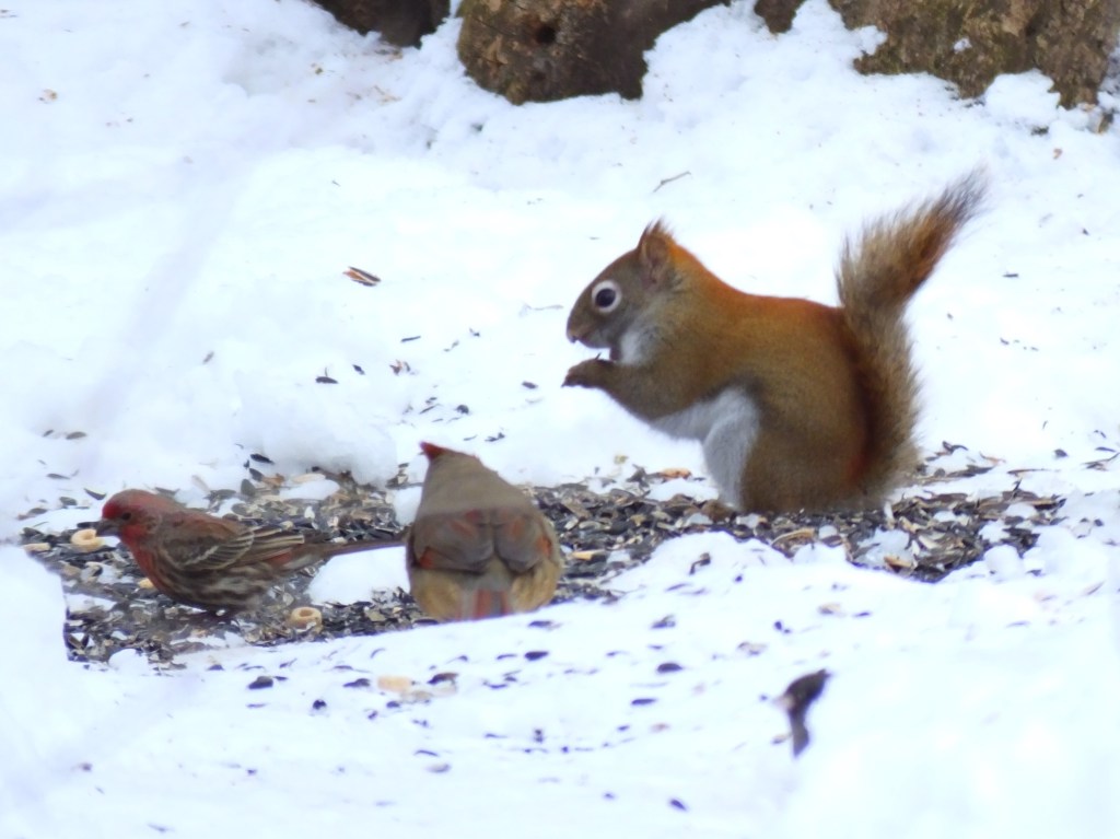 How sweet that the squirrel, cardinal, and sparrow can all get along and share in the bounty. A lesson for our elected officials!!