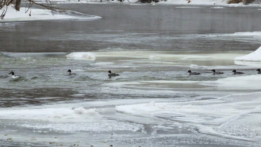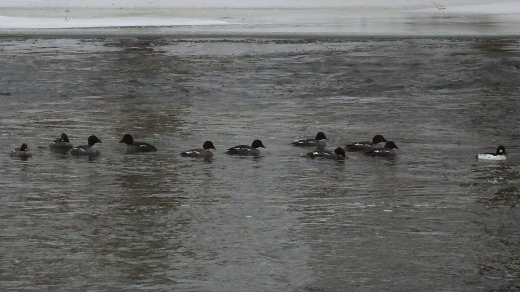 Further north, I was approaching the spot where the goldeneye’s have been hanging out, and I quietly approached the water to reconnoiter the situation from afar, when the single male, who must not have spotted me yet, led his flock downriver right towards me.