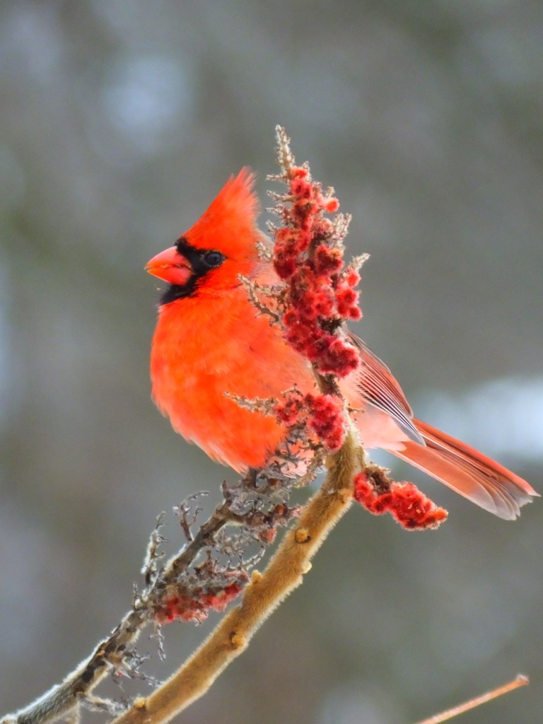 Lastly, the skies, the water, the eagles, the ducks, and the squirrels may all be shades of grey today, but the male northern cardinals are still rocking their brightest red. Yee haw!