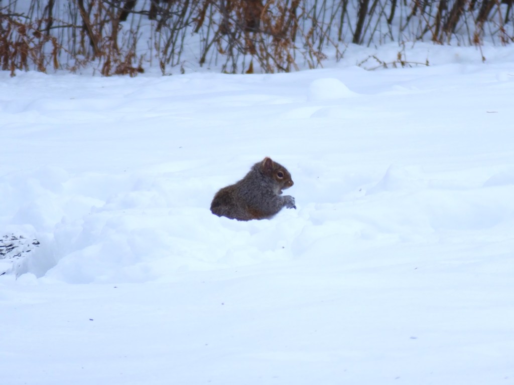 Finally, I swung by the pond again, but didn’t see a raptor there at all today. I did spot a squirrel, and hoped it was our little red friend, especially after the visit from the Cooper’s hawk yesterday, but, from the comfort of my dining room table, today’s visitor looks decidedly grey.