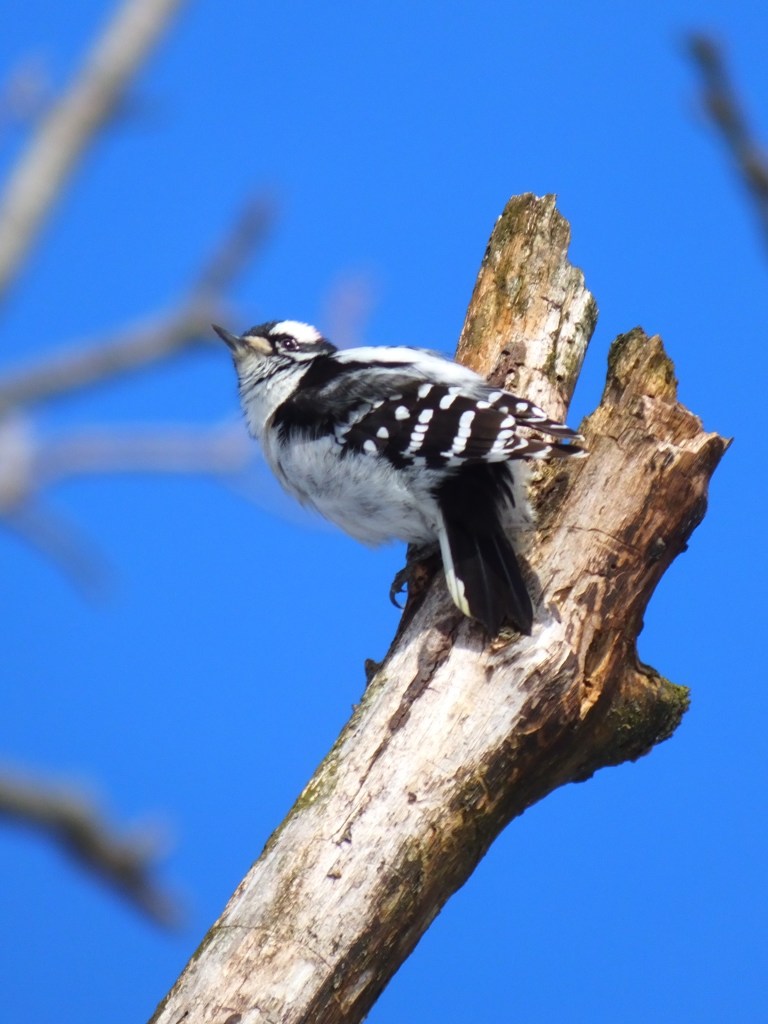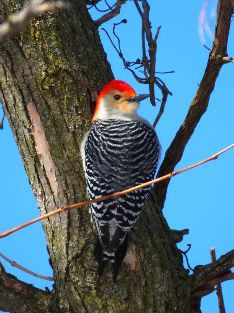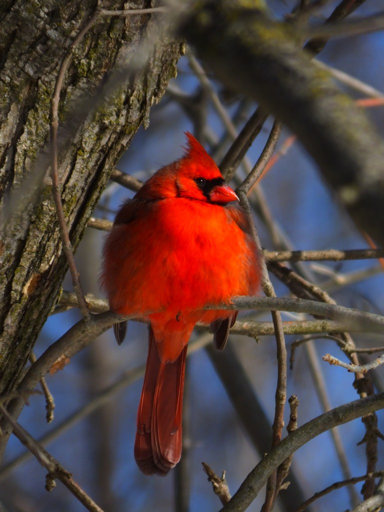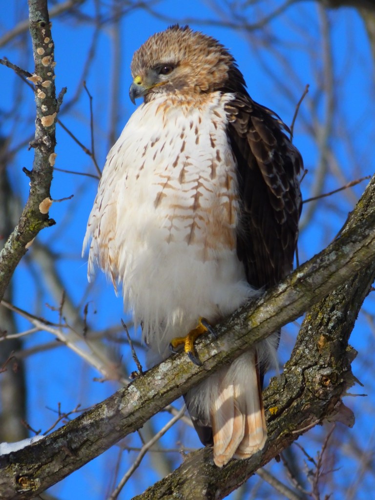 I spotted what I hoped might be a raptor from seemingly a mile away, and I had to check with binoculars to make sure it wasn’t just some snow on a tree. As I made my way towards it, at one point it made a try for a squirrel, but came up empty, and I was thrilled when it settle back down in the vicinity for me to continue my pursuit. In the end, I even crossed some of the frozen river, all the while trying to make it look like I wasn’t ever walking straight towards it, as my friend Drew suggested. I ended up about 20 feet away and right next to a tree to which I could hold my camera to eliminate jiggling. After I figured I must have gotten one good shot (out of 50+!) I continued north and was able to confirm from behind that it is indeed a red-tailed hawk, not some cheap knock-off, and it might even be the one we saw back in January feasting on a different squirrel.