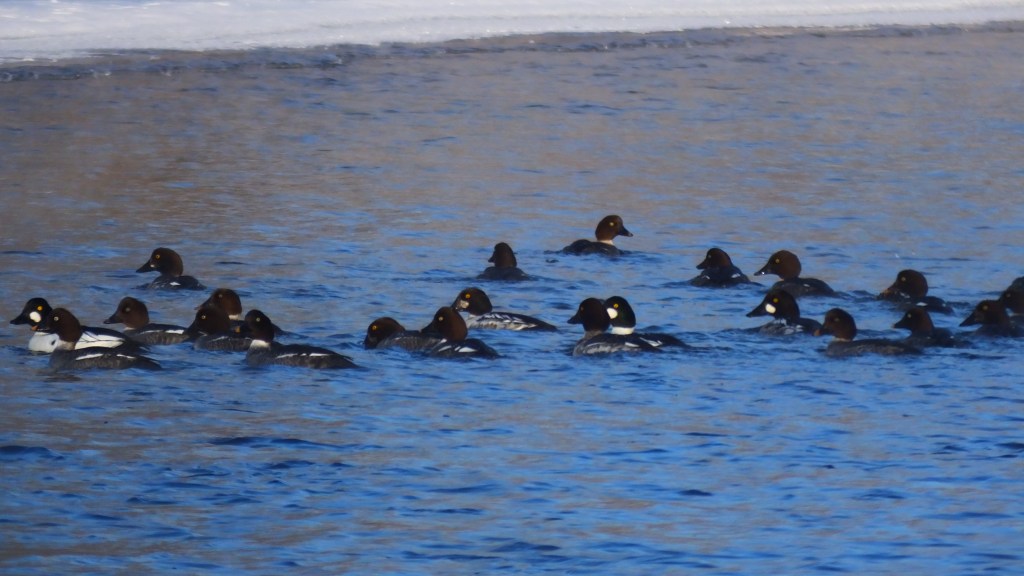 Not a whole lot to report critter-wise. A few mergansers, a few mallards, a slew of goldeneyes, and just one female bufflehead on the river. Here are a couple of a shots in which I attempt yet again to capture the size of the crowd. It is a sight to behold.