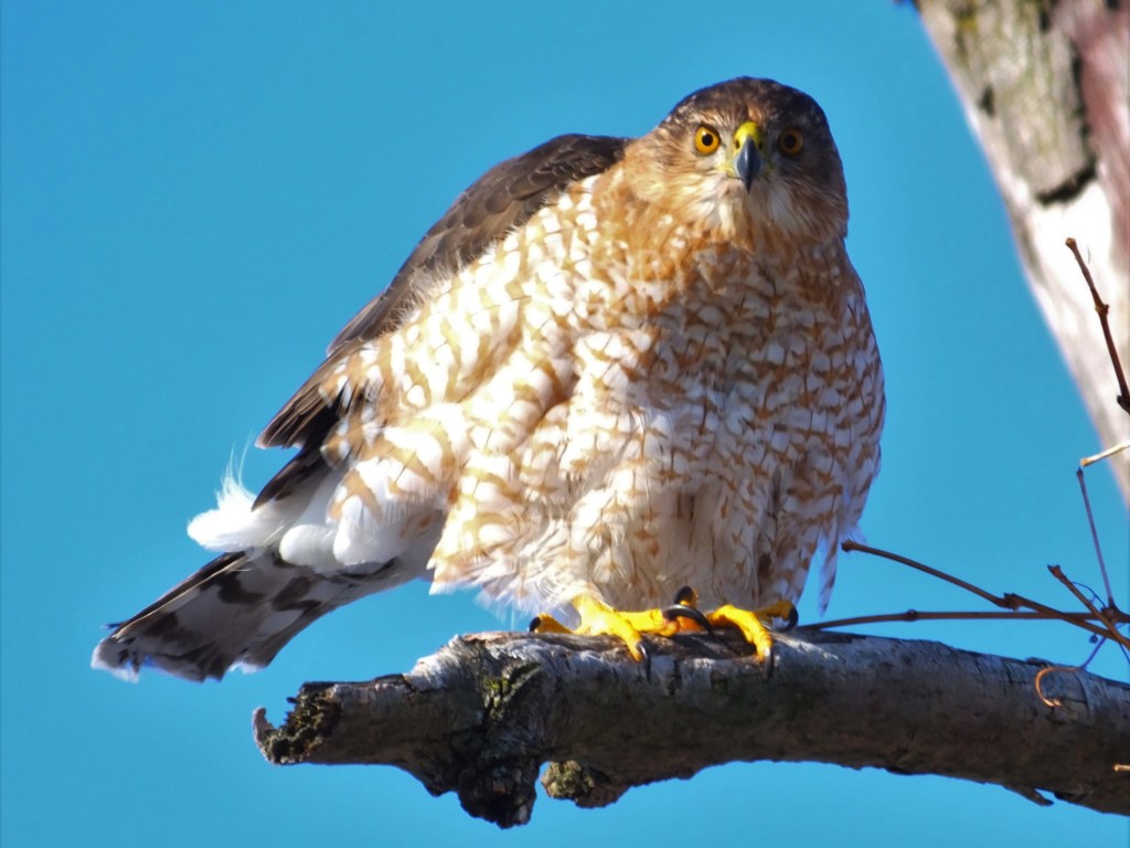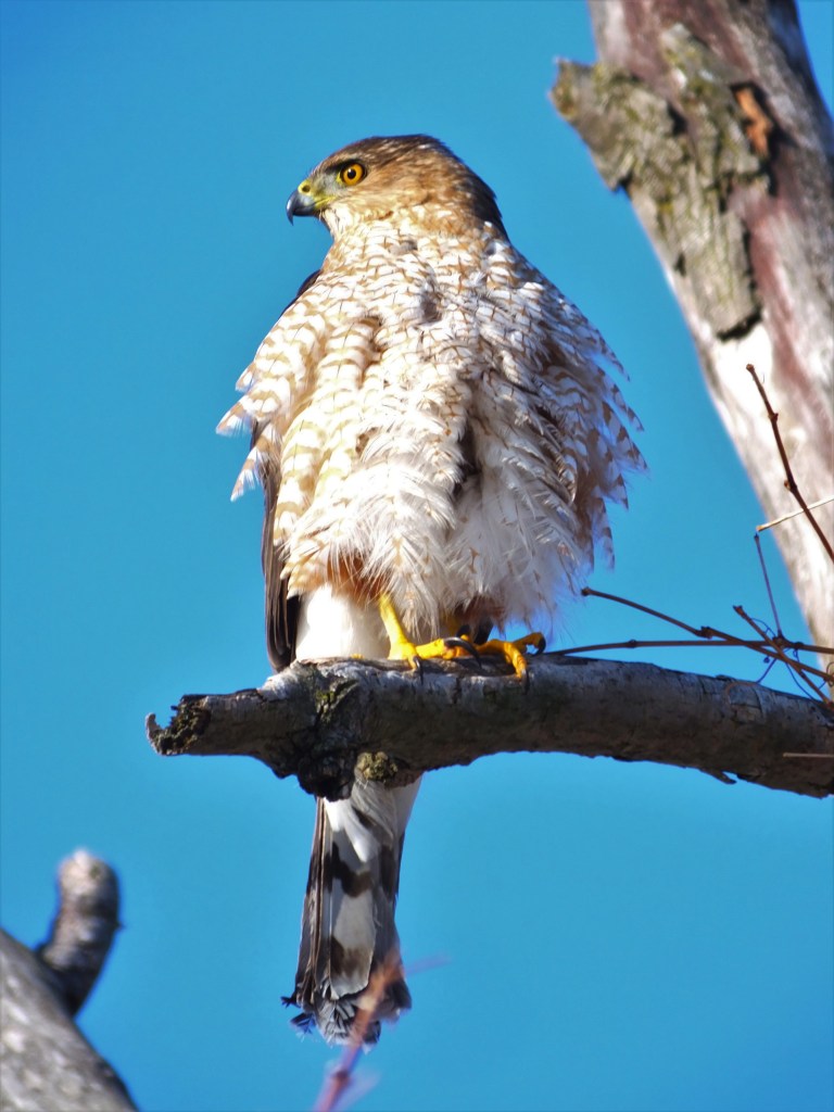 And, last, but by no means least, this magnificent creature, I think the Coopers hawk we’ve seen several times before, was waiting for me along side the Oak Leaf Trial. It even allowed me to walk past it, with my eyes averted of course, so that I could shoot with the morning sun at my back as it stretched a leg.
