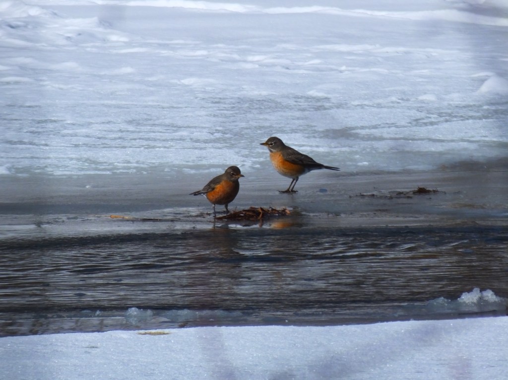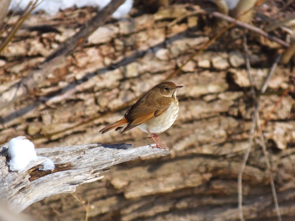 Our little buddy, the veery or hermit thrush was a bit south of where I usually find it, and perhaps it was think that I, standing on the river ice, was west of where it usually finds me.
