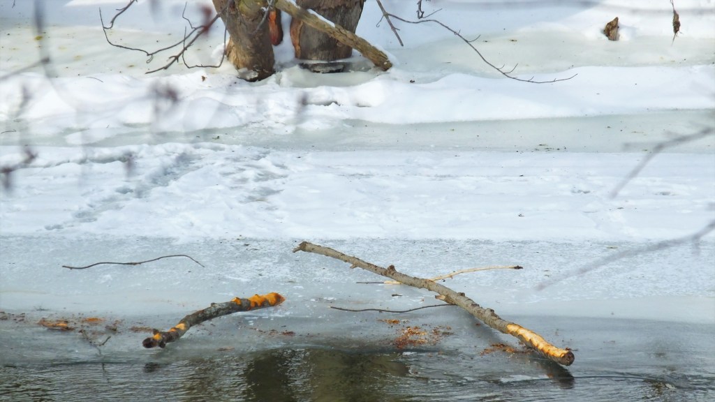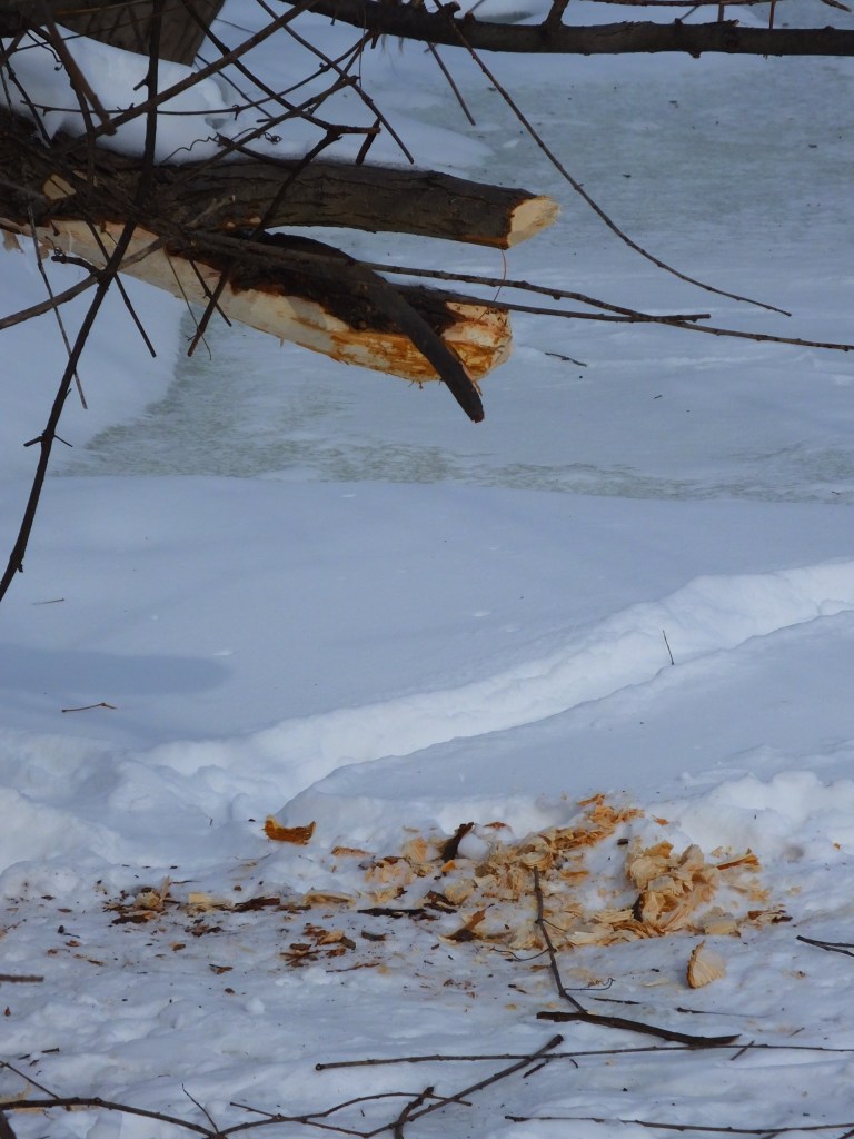 And they are hungry! As our long deep freeze finally eases up, the beaver, who we haven’t seen even a single wood chip from since December, finally ventured out last night, and they left freshly cut and debarked logs on the ice in at least four locations along the lower river. Since I walked on the ice for much of the river yesterday, I can confidently assert that these were not there then.