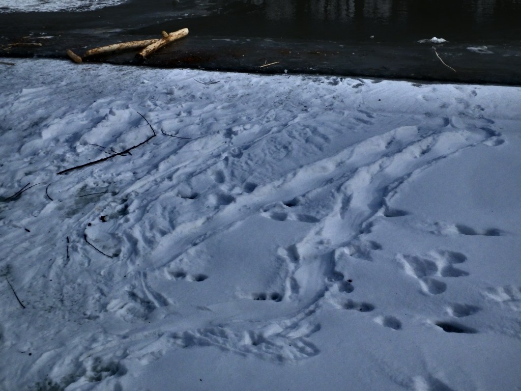 On the other side, I believe I can now confirmed who left that mystery track in the snow we saw yesterday. The lack of foot prints either beside or behind was what perplexed me. Now I’m confident that beaver cover their own tracks in the snow with that fancy tail they drag behind.