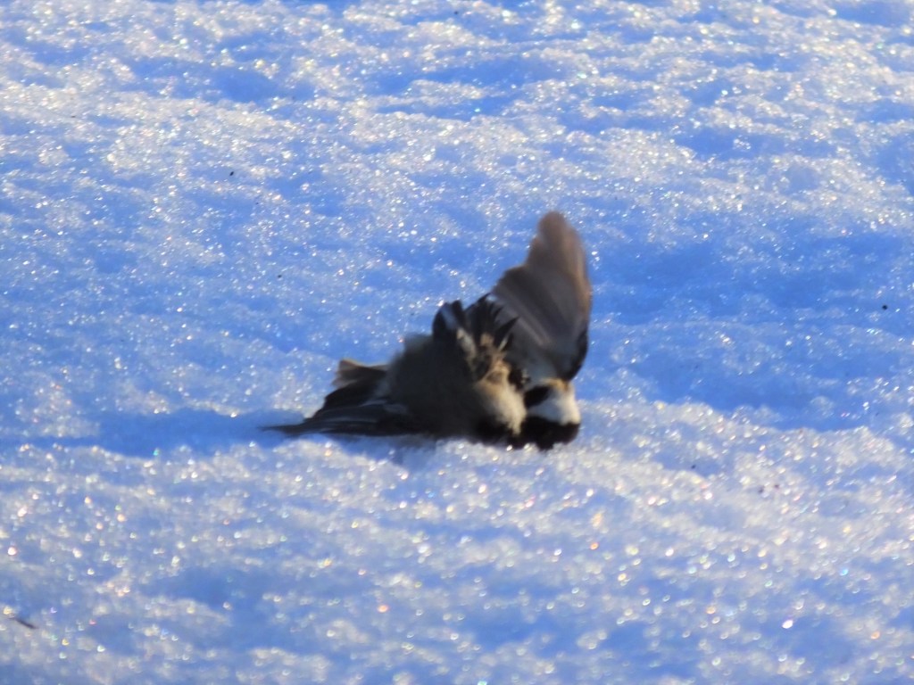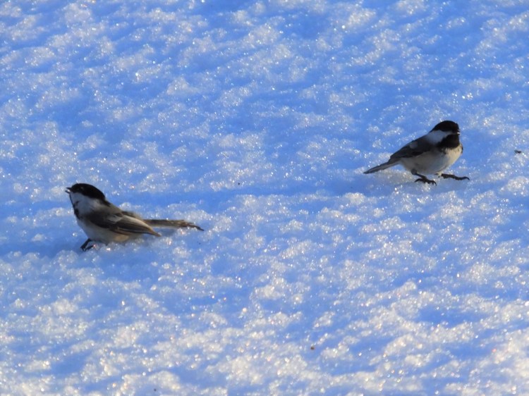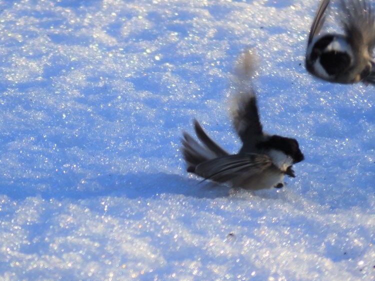 And the beaver are not the only ones who appear to have noticed a change in the weather. Here are a pair of chickadees who thought it was warm enough to wrestle in the snow!