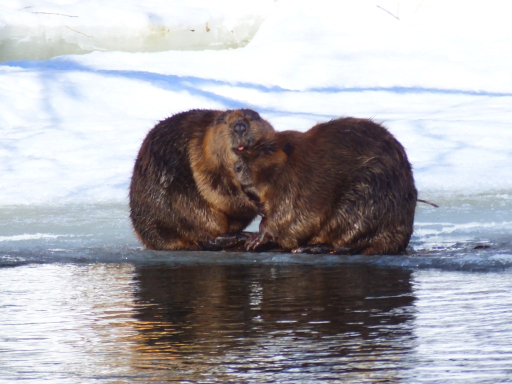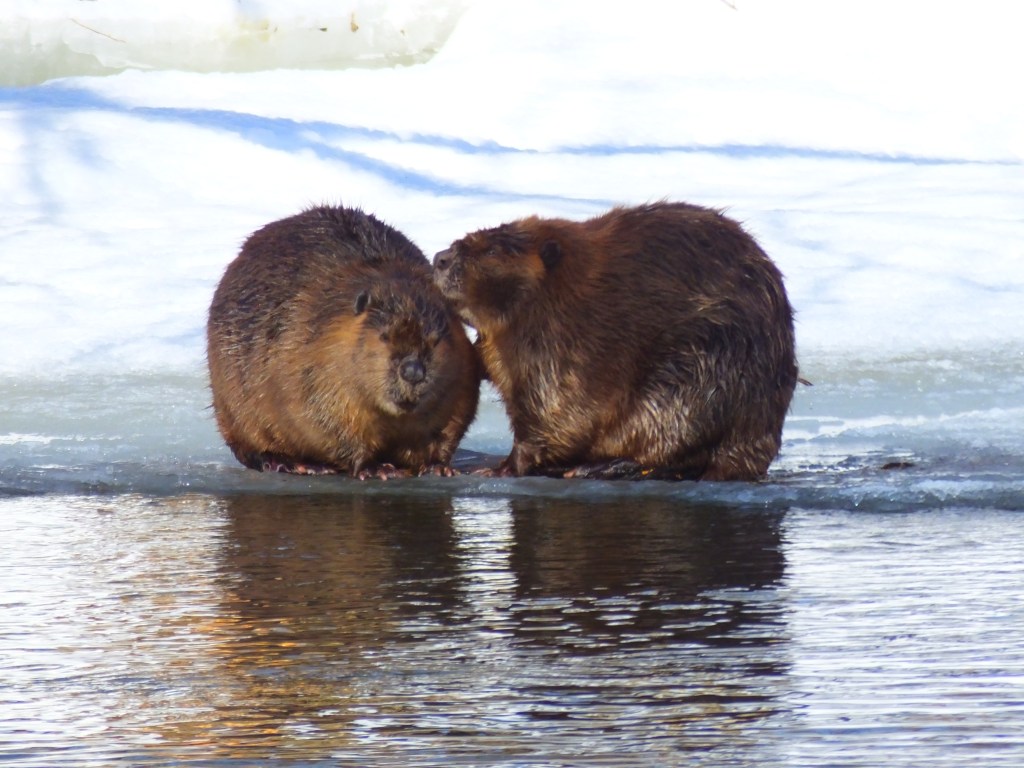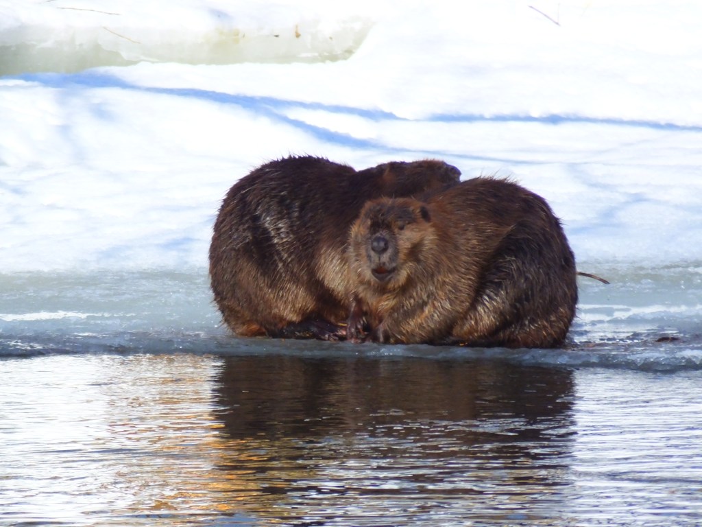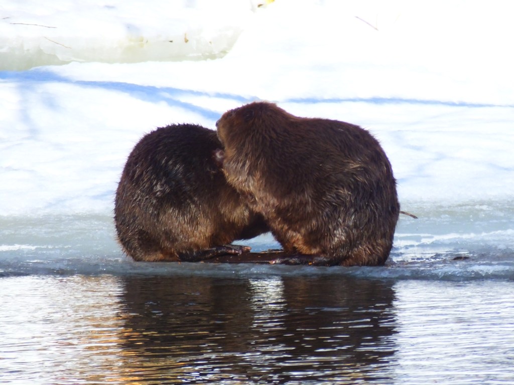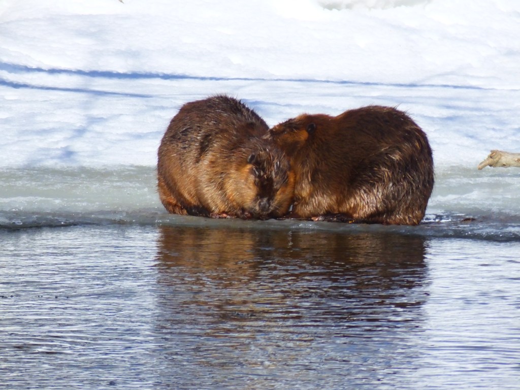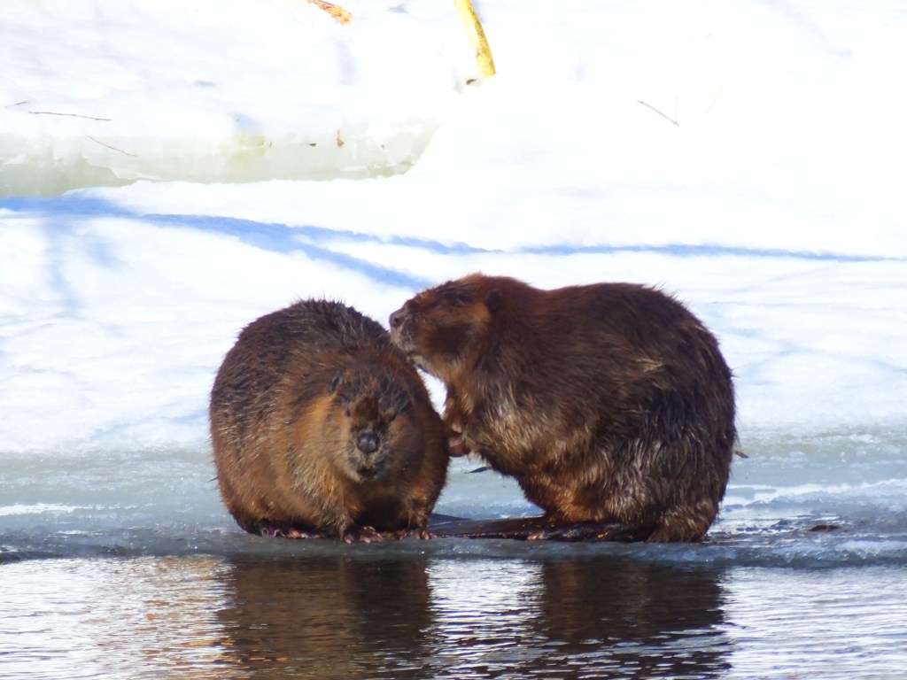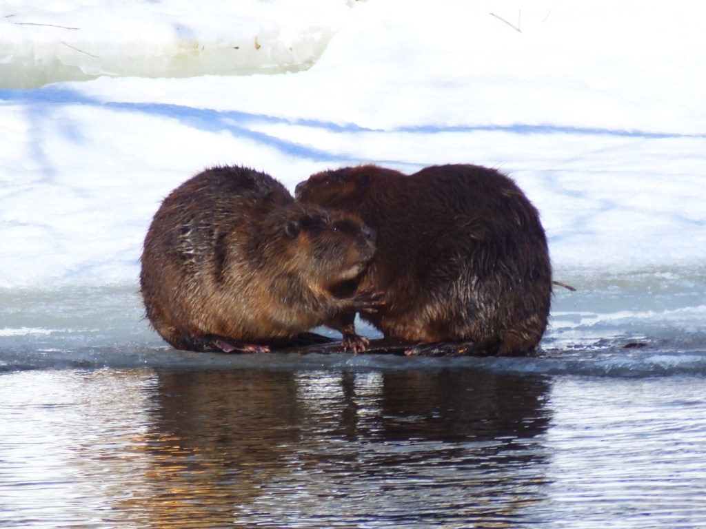 The one beaver we saw on Sunday must have reported back to the burrow that the deep freeze has indeed broken because today there were two of them, seeming to nuzzle and snooze together on the river ice in the bright morning sun.