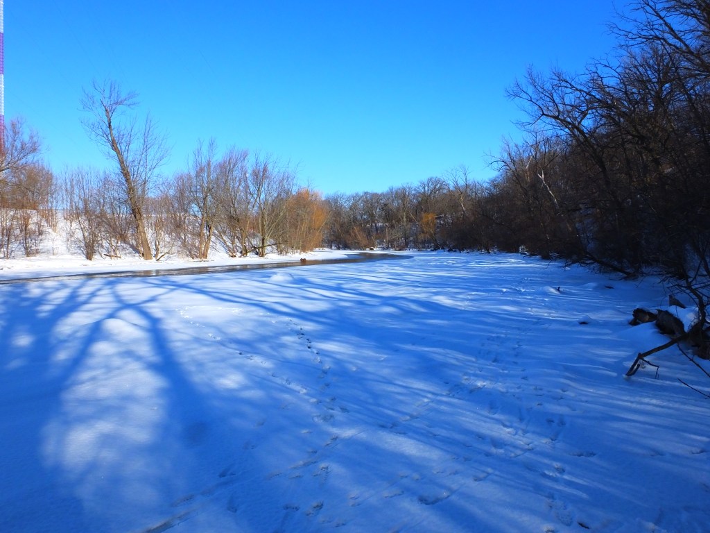 Finally, here a shot of the whole river “valley” with the two beaver just to the left of dead center. Still plenty of ice left, but I stayed off of it today, mostly.
