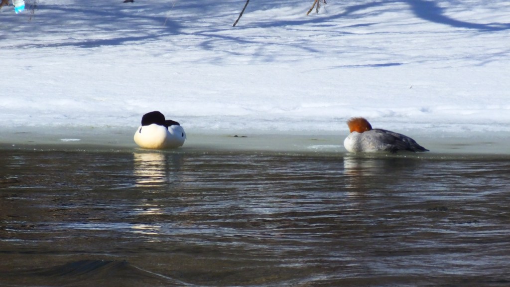 Here’s a pair of common mergansers also enjoying a snooze on the ice in the sun, although I did catch her keeping tabs on what I was doing across the river.