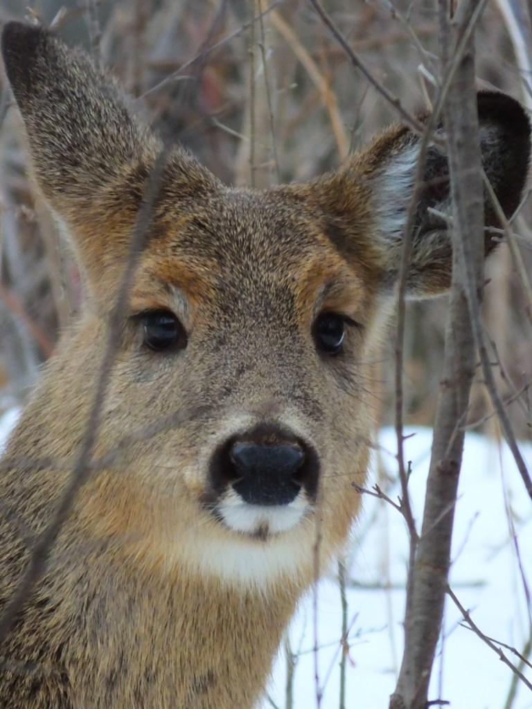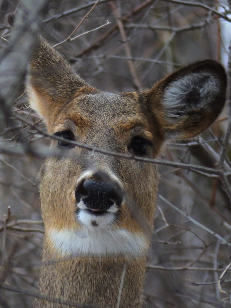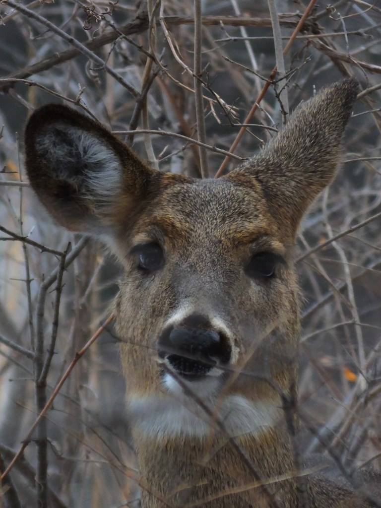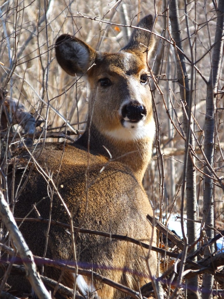 Anyway, the deer seemed unperturbed, and perhaps they were just thrilled to lying on leaves instead of snow for a change. It is fun to watch them simultaneously keep tabs on me and also check on who might be sneaking up behind them with those ears of theirs.