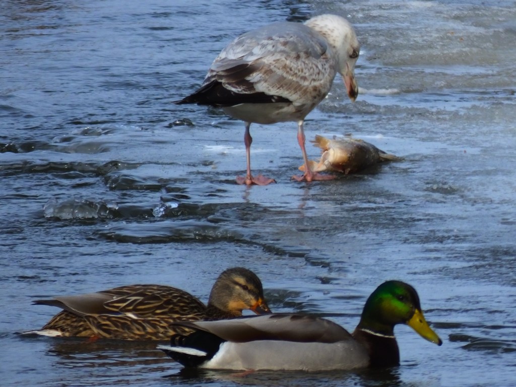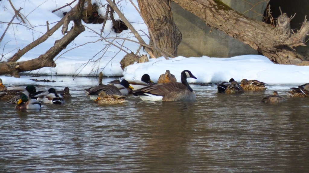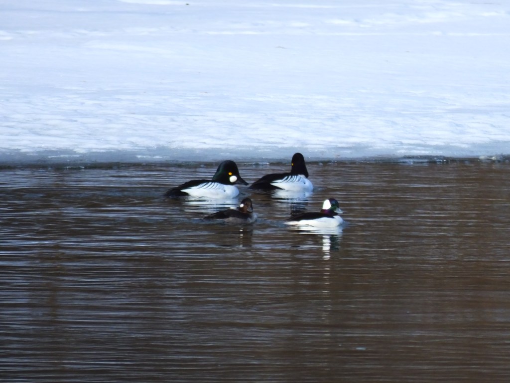 And the buffleheads and some goldeneyes, along with plenty of mallards, a goose or two now, and even a young herring gull, are back on the upper river, just above the falls, now that a lot of the ice has cleared out and there’s some open water again.