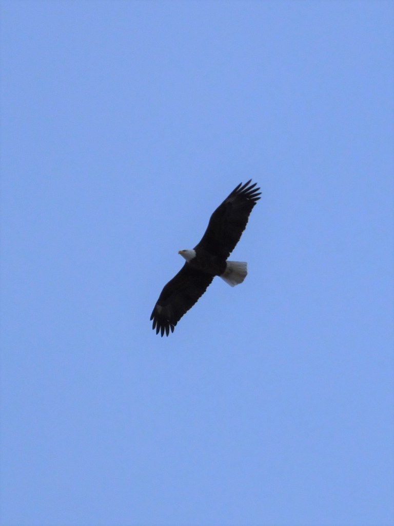 As I was taking pictures of the ducks, it slowly dawned on me to notice that they all seemed to be hugging the shore, especially under overhanging trees. So I finally looked up, and sure enough, an eagle glided into view. It stayed high, though, and soon continued south, so no ducks bothered to take flight this time.