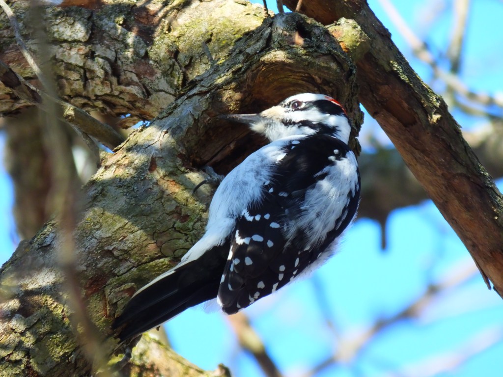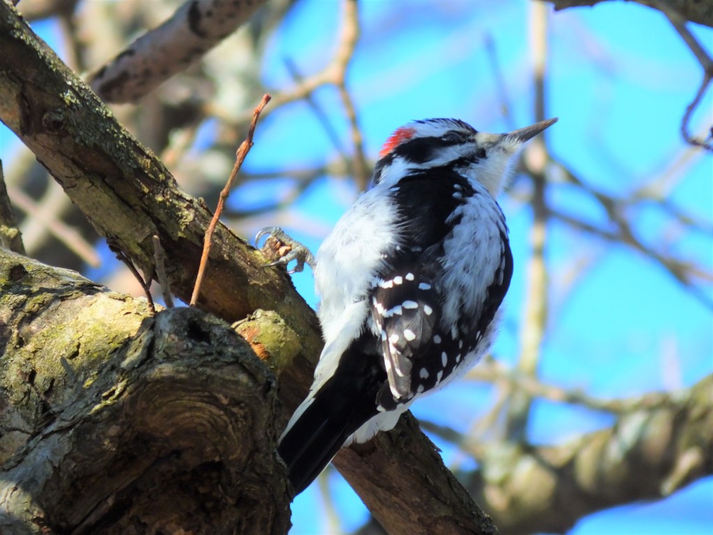 Anyway, there were no ducks there today, but I did see this handsome male hairy woodpecker working intently on a branch.