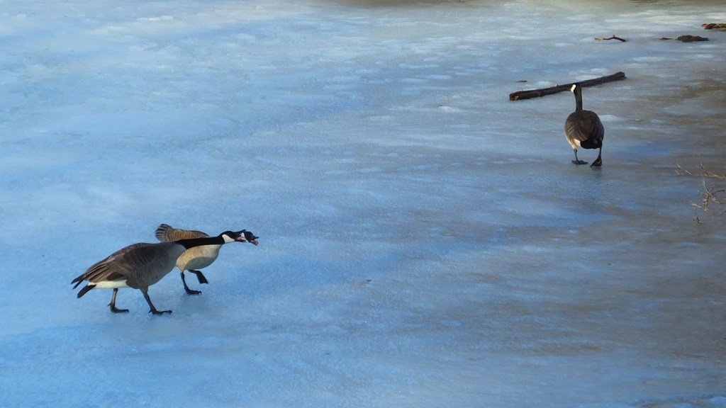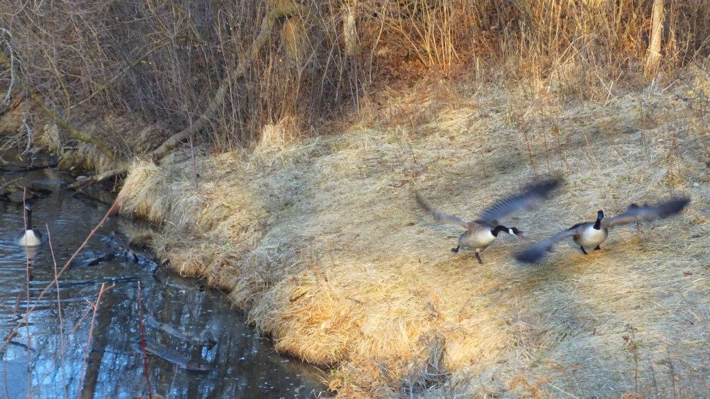 The big news in Estabrook is that the water fowl are starting to arrive back on the pond. We first saw a couple of Canada geese surveying the frozen situation from shore Saturday, but now that the open water is up to a solid (liquid?) 5%, there are a fine-looking pair of mallards…