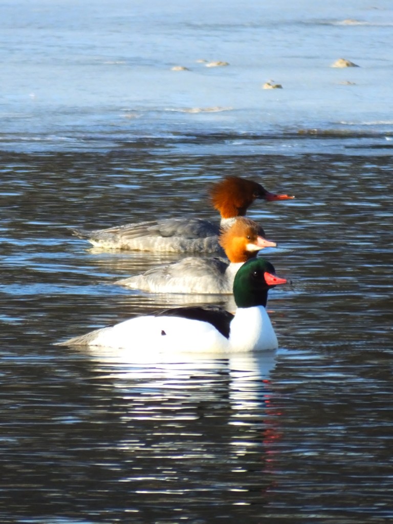 Once I got to the water, I was thrilled to see that, between the two islands, it is still full of mallards, goldeneyes, and mergansers, including this dashing trio of commons…