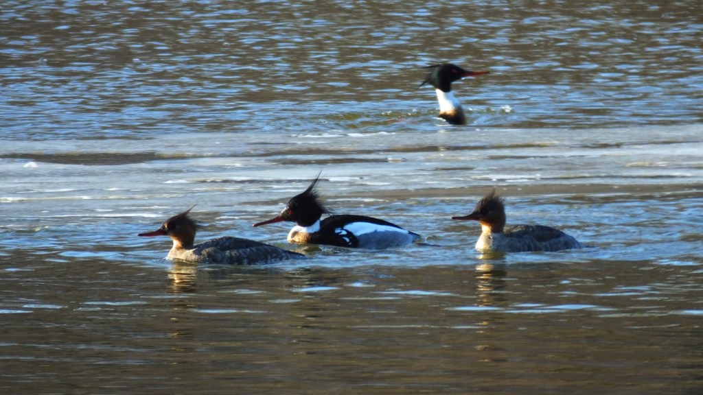 … and more red-breasted mergansers than I believe I’ve ever seen in one place before, including this debonair quartet.