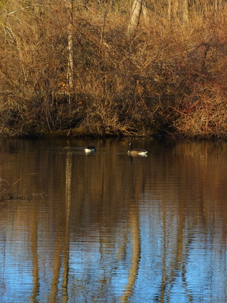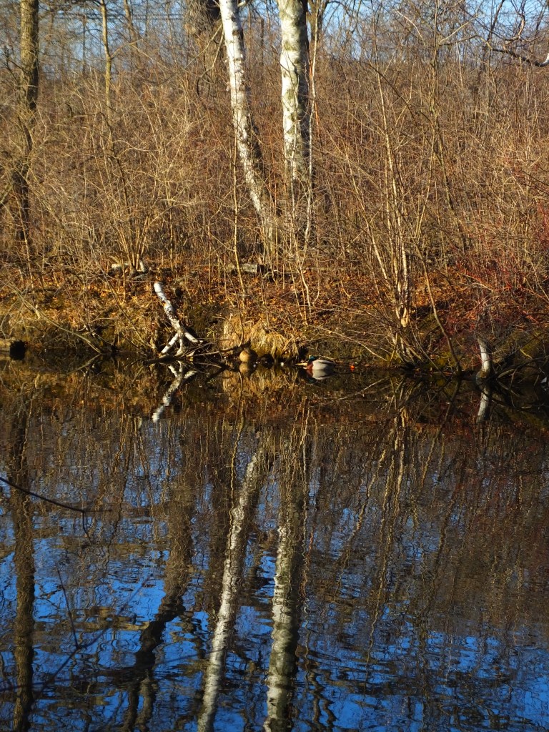 It was a very nice morning in the park, with calendar appropriate temperatures for a change. At the pond, the ice is almost all gone, the pair of mallards were napping in the morning sun, and the pair of Canada geese were feeding.