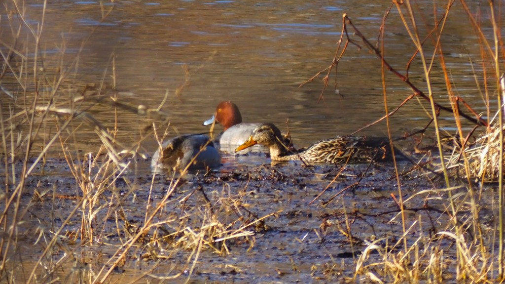 Plus, one of our redheads was there too, dabbling with a pair of mallards. I thought they might have bugged out by now. Depending on the map you consult, we are either in their “migration” or “non-breeding” zone, although we are near a “year-round” zone in the latter map. Maybe this guy is pushing the envelope.