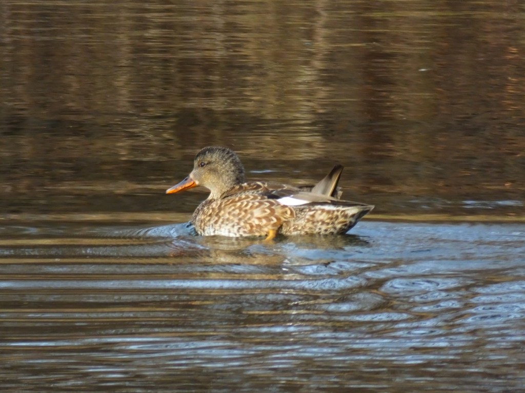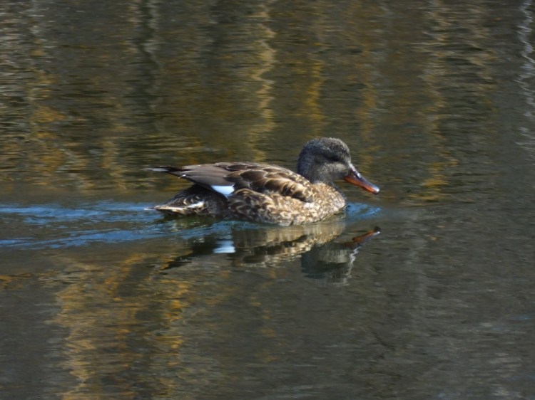 After I gave it what I thought was my best shot and pressed the “publish” button, the decision still gnawed at me, and I dug even deeper, which led me to a nice page published by “The Wildlife Trusts” on “How to Identify Dabbling Ducks“. That’s where I found a match for the missing detail of “the small white speculum on the wing”, which makes her a female gadwall (Mareca strepera), not a female American black duck, which I now read has a purple speculum. Live and learn, we hope, right?