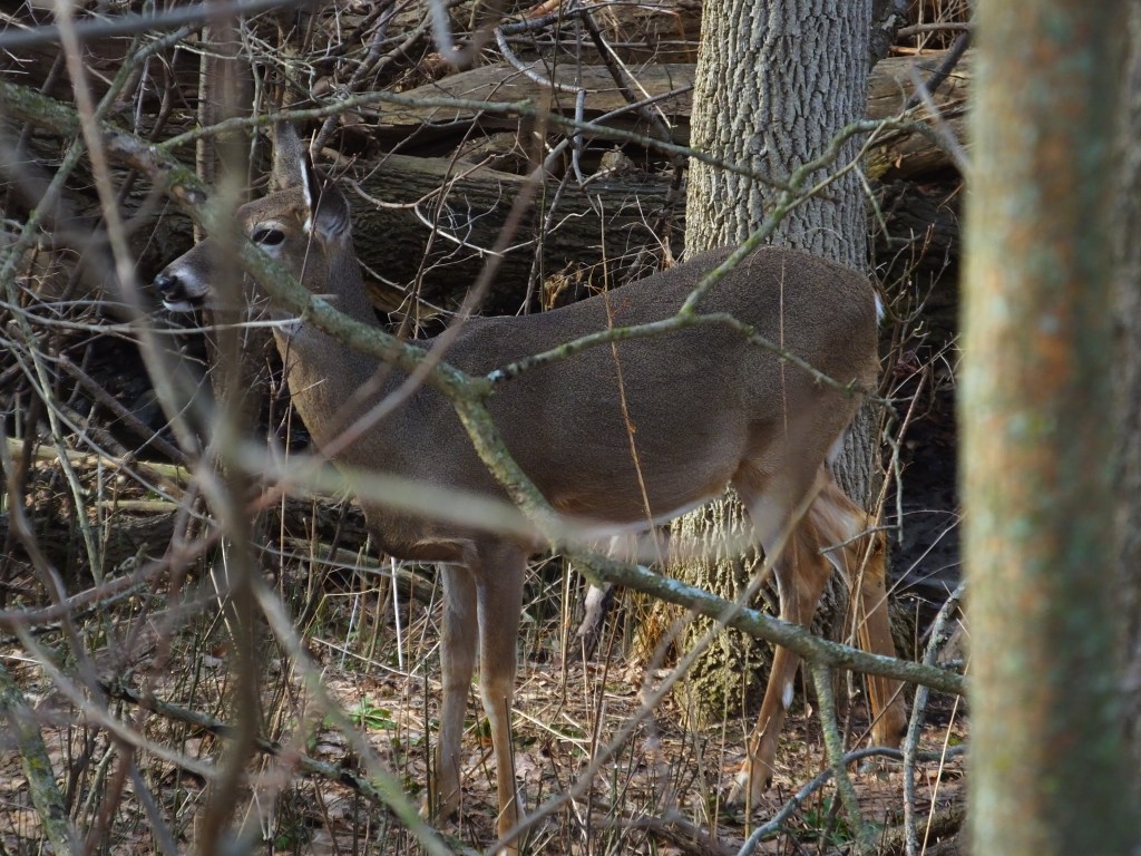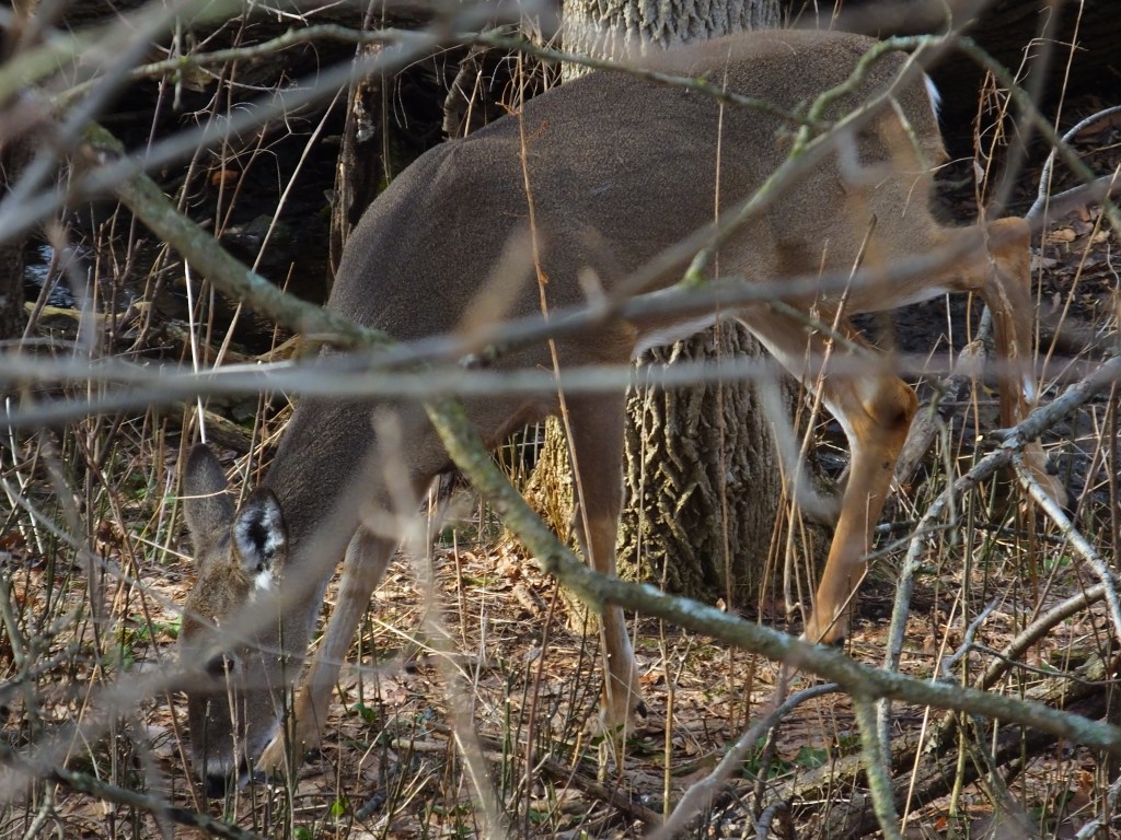 On my way back up the bluff, I spotted our deer quartet, whom we haven’t seen in weeks, in the very spot where I first stumbled upon park deer almost a year ago. They were pretty deep in the brush, so I only have presentable images of one of them, who clearly found me so threatening, that she had to lie down.