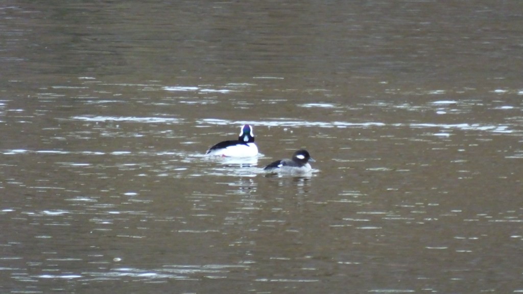 The situation was similar on the river. There are a lot of Canada geese jockeying for prime nesting sites and a bunch of mallards feeding along the shore. I didn’t see our new yellow mallard hen again today, and there were no mergansers, goldeneyes, or scaups, but I was pleasantly surprised to see the bufflehead couple again.