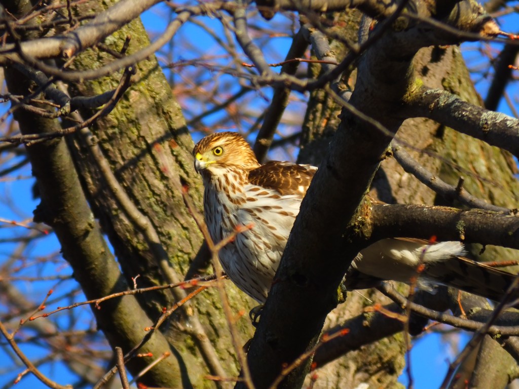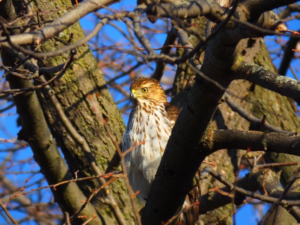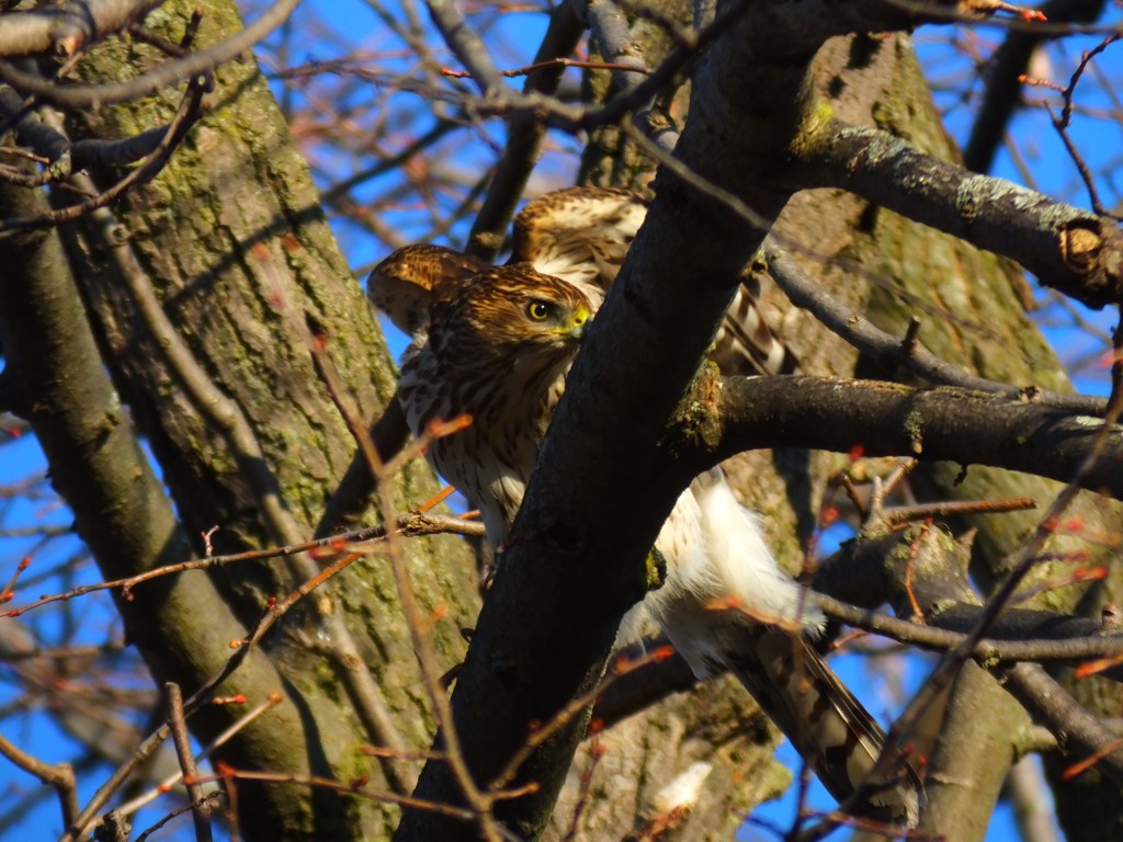 I couldn’t find the wood ducks again this morning, neither on the river nor on the pond, and was making my way home empty-handed, when I stopped to check on the Cooper’s hawk nest I spotted under construction yesterday. Is I searched the treetops for it or the hawk itself, a bird watcher came by whom I see every now and then in the park or on the Oak Leaf Trail.