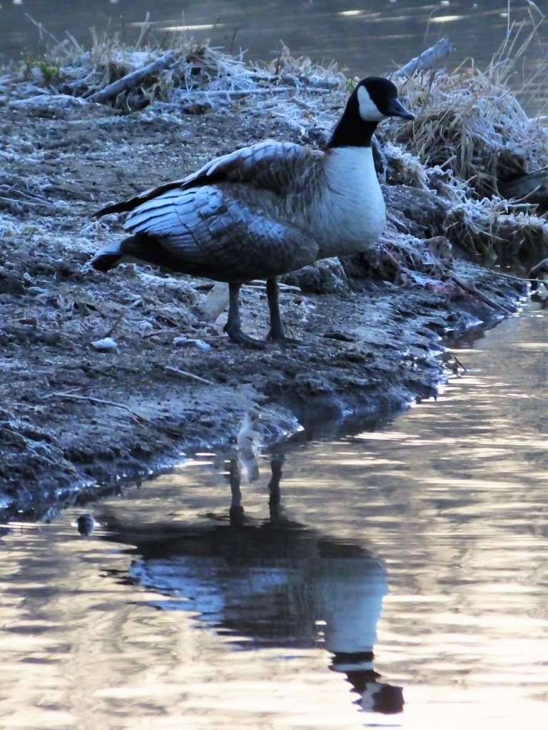 Yikes, it was cold out this morning. I wish I had worn my good winter mittens. The soil was quite crunchy with needle ice in places, and this goose, who appears to have spent the night snoozing on the mudflats by the river, had a nice heavy coating of frost on its back and wing feathers.