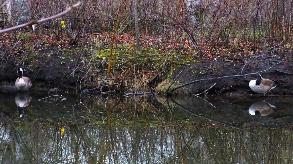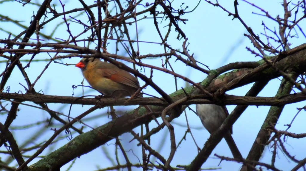 While I was checking on the geese, I spotted these two birds on a branch, and wondered what they were up to. From afar, I thought maybe there were waxwings, whom I often see in pairs.
