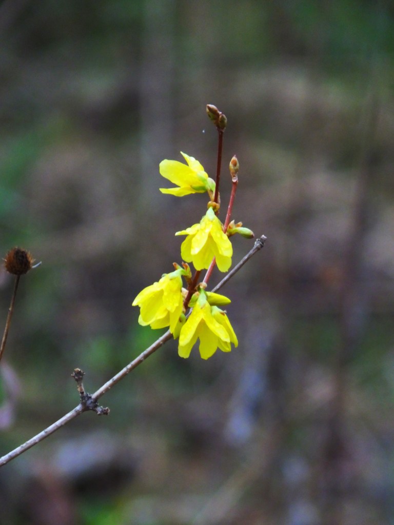 PS. Here’s you splash of color, after all those browns, greens, and greys, a scraggly forsythia growing wild on the slope below the beer garden.