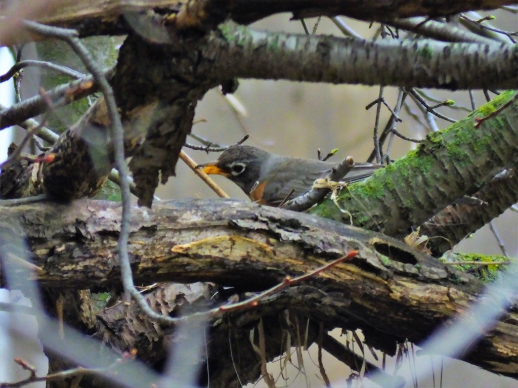 Lastly, here’s a robin wrestling a piece of straw into her nest just over the river trial.