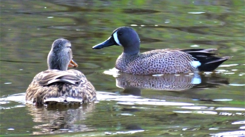 At the river, I spotted a solo blue-winged teal drake off the mudflats with a pair of mallards. Here he is cutting in front of the mallard hen. With that face, I guess we should expect that he’d be cheeky, eh?