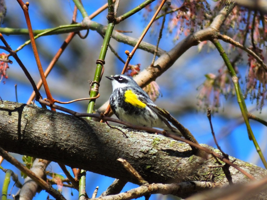 Finally, still at the north end, I spotted at long last our first warbler for the season. I’ve been hearing of sightings for a couple of weeks now, but this is the first one I’ve been able to capture in an image. It is a male yellow-rumped warbler (Setophaga coronata) in “Myrtle” plumage, on his way to breeding grounds that start upstate and continue to Hudson Bay.