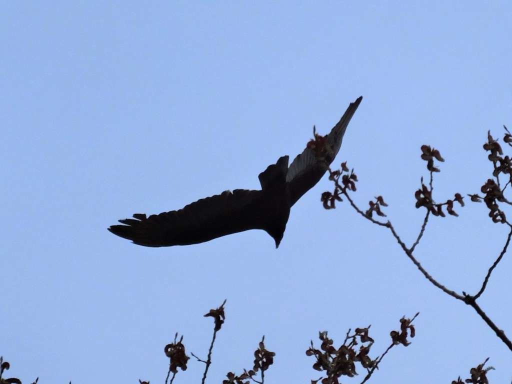 I hardly saw another creature, mammalian or avian, but I did finally manage to capture an image sufficient for identifying a large bird I’ve seen soaring over the park from time to time since last summer. Say hello at long last to a turkey vulture (Cathartes aura). You can see the tail narrower than a red-tailed hawk, but not as narrow as a Cooper’s hawk, the long beak with a little curve at the end, and the lighter flight feathers on the underside of the wing. I would take that positive ID to court!