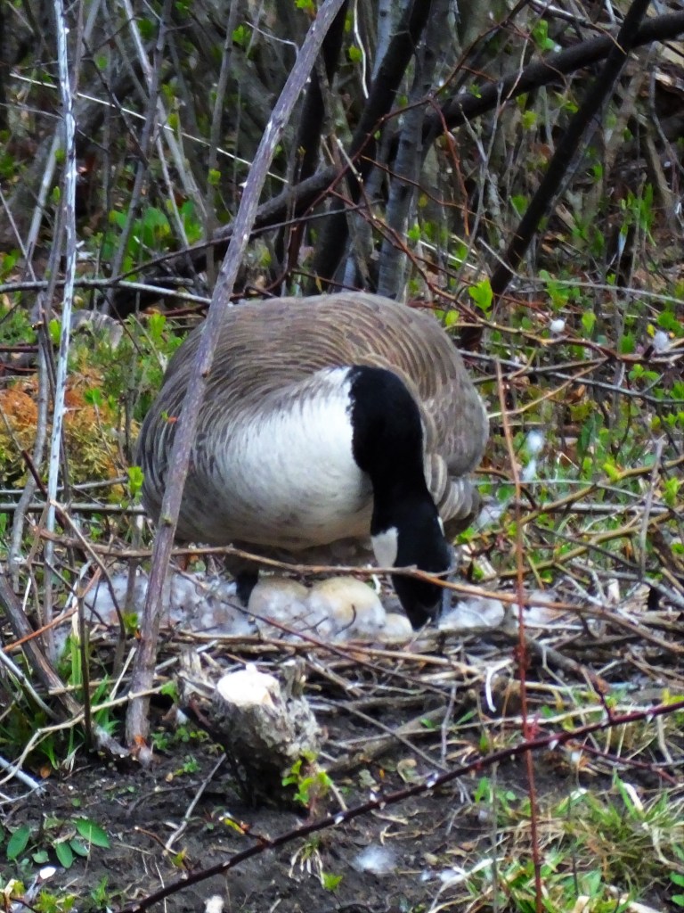 On the island in the pond, the goose on the southern tip got up briefly to gave her eggs a turn this morning, and I can count at least three of them, so that’s super encouraging. The one on the northern tip was on her nest as well.