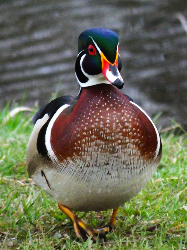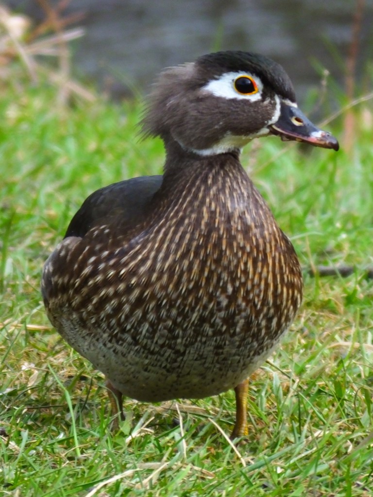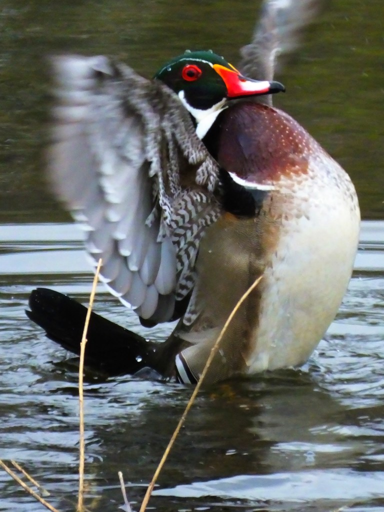 Finally, all five wood ducks, two hens and three drakes, came to see if there was anything new to eat, so we get some nice wood duck portraits for a change.