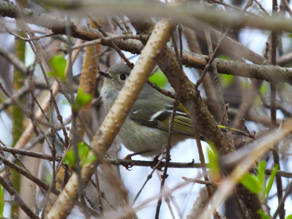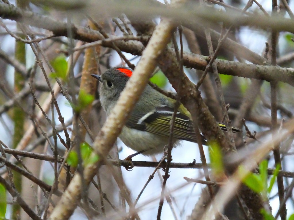 Also at the pond was this little ruby-crowned kinglet, delightfully whistling while he foraged for bugs from branch to branch, all the while teasing me with glimpses of his little ruby crown.