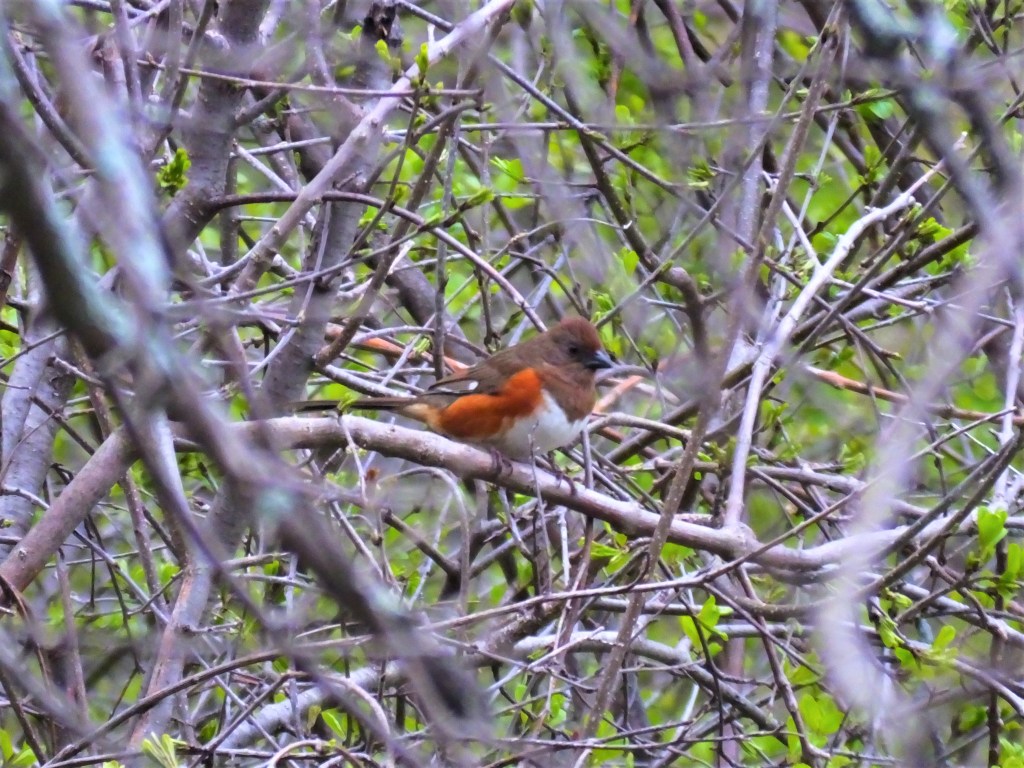 Lastly, I caught a glimpse of another newcomer to the pond, a female or immature Eastern Towhee (Pipilo erythrophthalmus), back from wintering approximately south of the Mason-Dixon Line and whom we haven’t seen since last May.