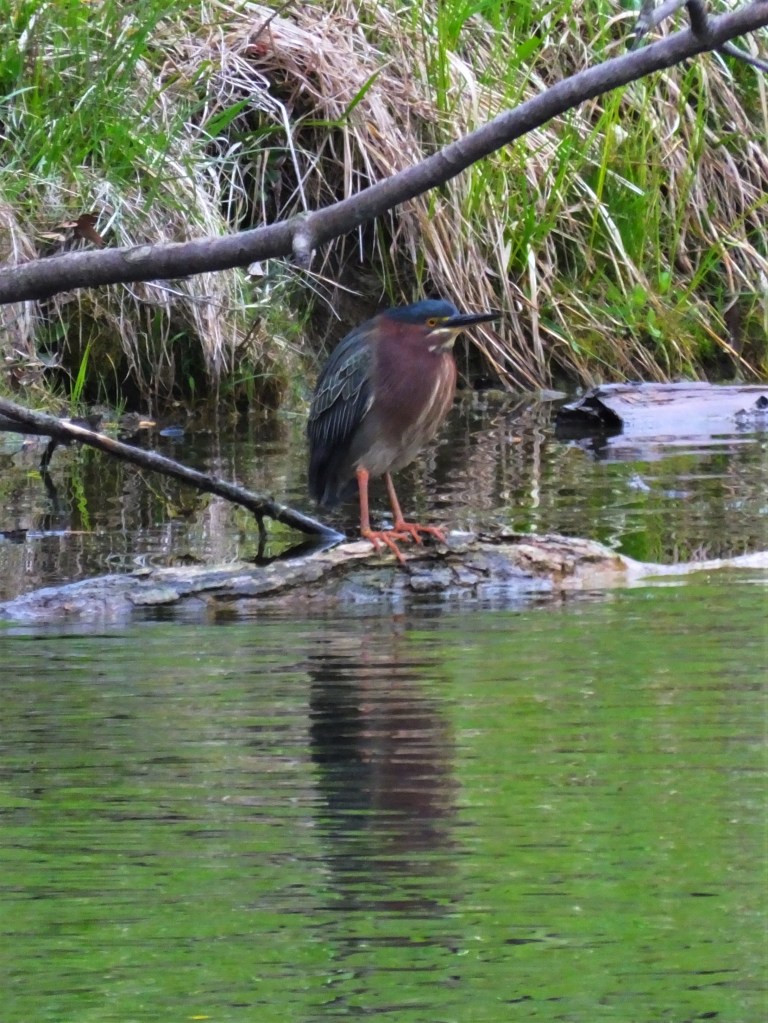 Its our old pall from last summer, the green heron (Butorides virescens), back from wintering along the Gulf of Mexico. Talk about your classic “snowbird”, eh? There were actually two of them, but I didn’t see the second one until they decided to go fishing.