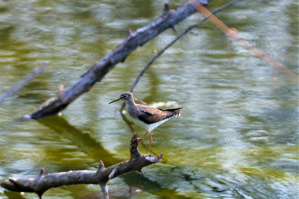 On our way home, we stopped by the pond again, where I was stunned to find another solitary sandpiper, taking a breather on its way to the north shore of Lake Superior. The pond doesn’t have much for sand, so I hope it finds one of the many sandbars down on the river exposed by the low water.