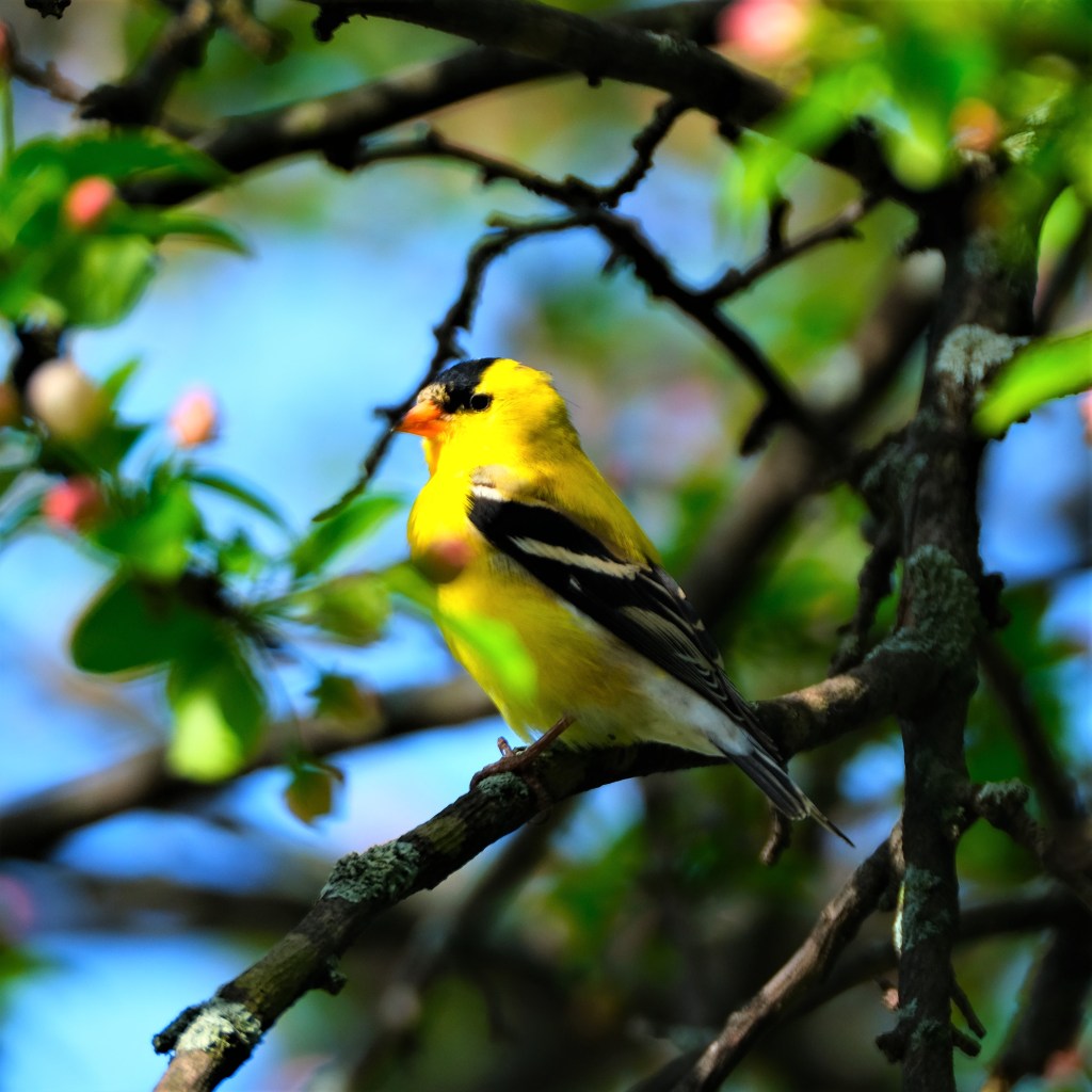 Finally, at the south end, this male goldfinch was singing so nice and looking so sharp in its new yellow coat and bright morning sun that I just had to take a picture.