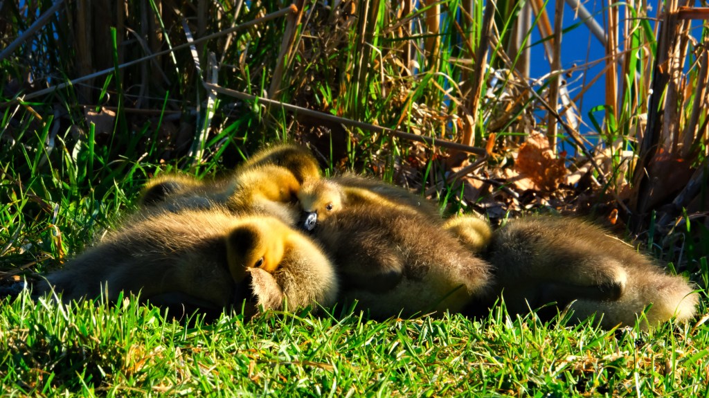The cold continued this morning, but the sun sure takes a bite out of it these days. The goslings at the pond appear to be doing fine, and were taking an after-breakfast nap when I arrived.