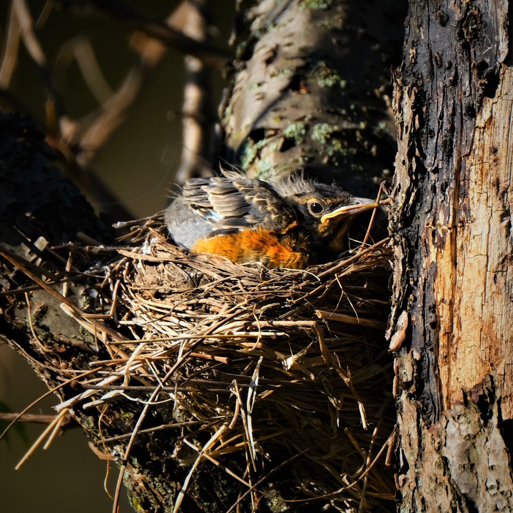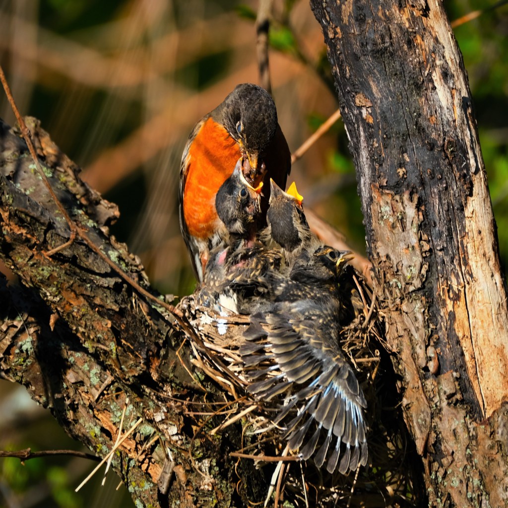 At the river, the robin chicks are growing up fast, and I see Dad at the nest more often than ever now. One unlucky chick chose a poor time to stretch its wing, though.