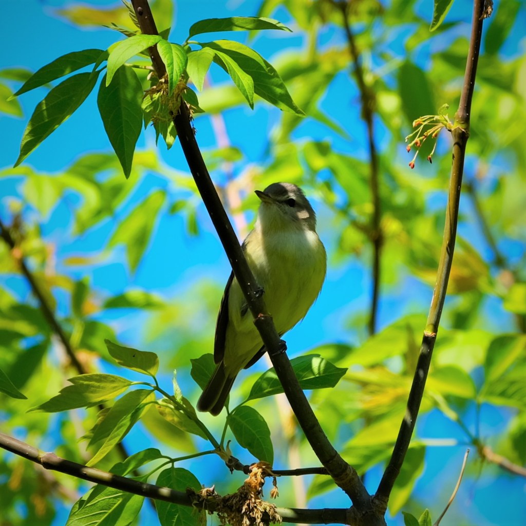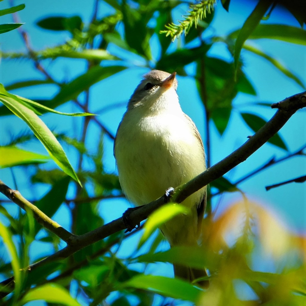 On my way back south, I believe I finally stumbled upon a new species for us, a warbling vireo (Vireo gilvus). It’s a relative of the red-eyed vireo we saw last summer with an even less-assuming appearance and a marvelous song. In fact, its appearance is so nondescript that I’m sure I already have pictures of one that I simply could not identify, and even needed a couple images today to be sure. It doesn’t help that it keeps to the treetops.