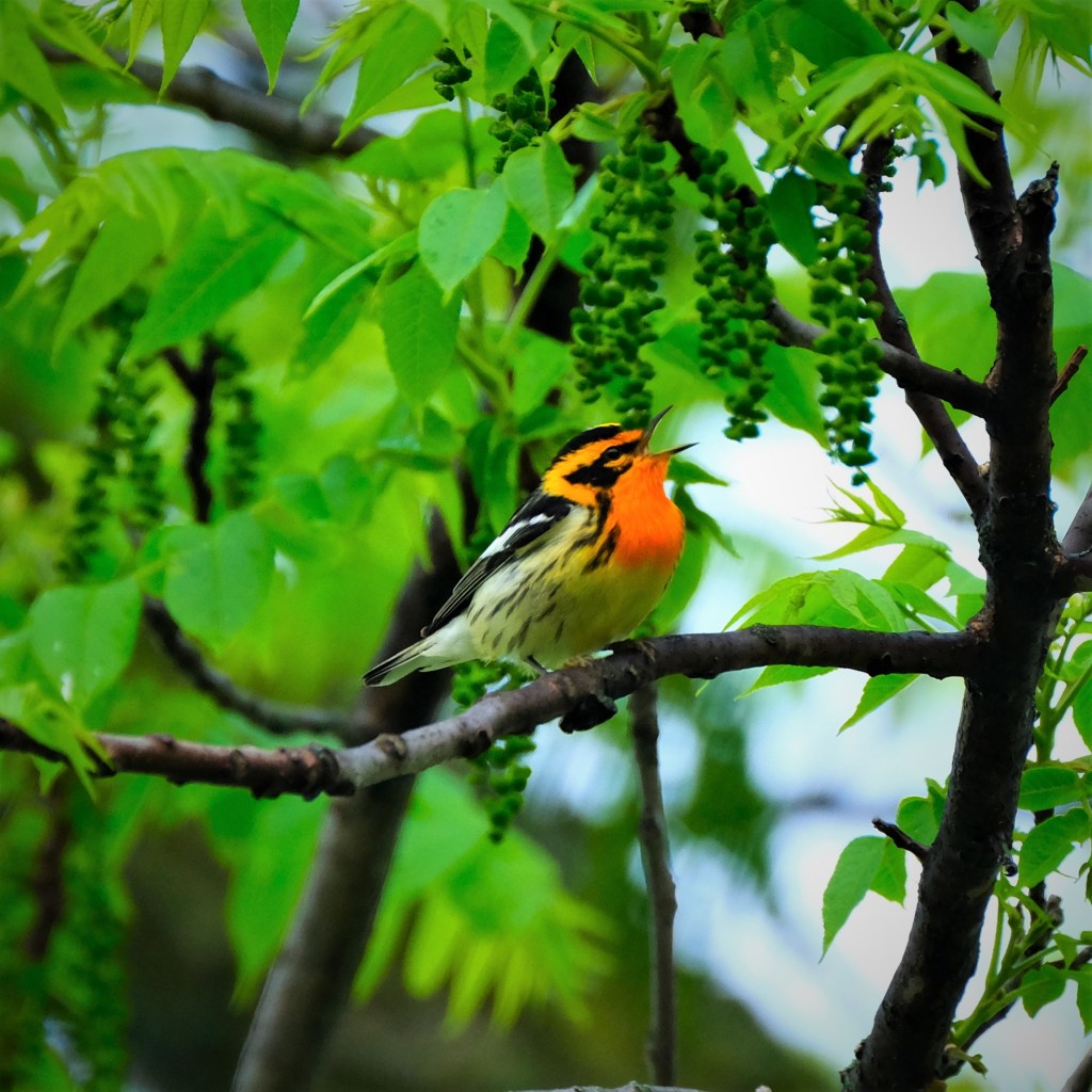 I should go out an buy lottery tickets for lunch because I can’t believe the string of luck I’ve had this morning. The air was cool, but not cold, humid, and calm, and so perfect for bugs and therefore perfect for birds. I hardly got into the park before I happened upon this little ray of sunshine: a Blackburnian warbler (Setophaga fusca), whom I’m pretty sure I’ve never seen before, and who must have missed the flight from South American that got in yesterday.