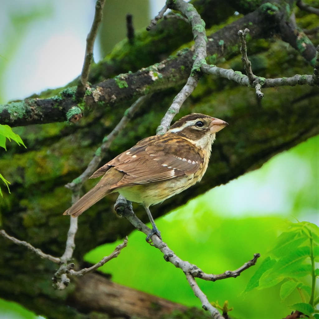 The tree he was in, right beside the southern parking lot, was loaded with birds, and when he hopped out of range, I turned my attention to this understated cutie, a female rose-breasted grosbeak to go with the male we saw just a couple of weeks ago, but whom I don’t believe I’ve seen before.