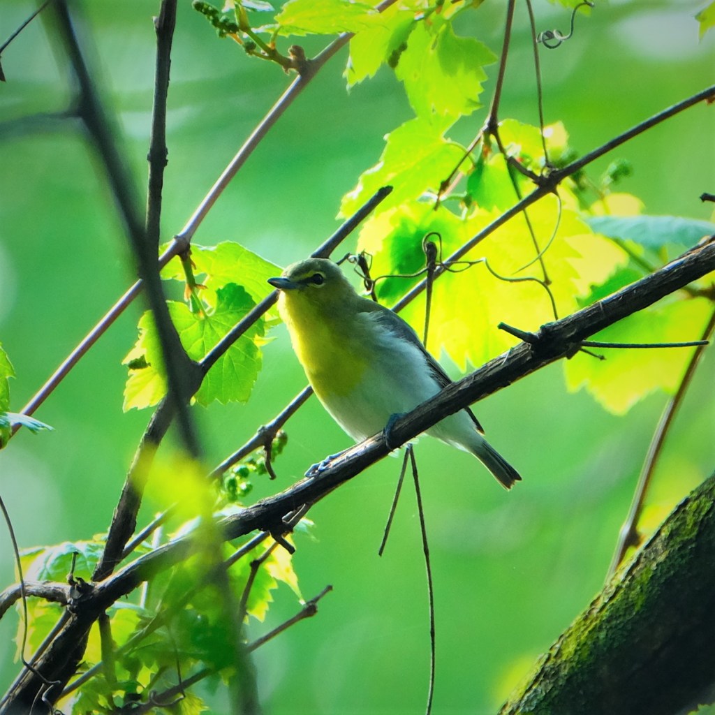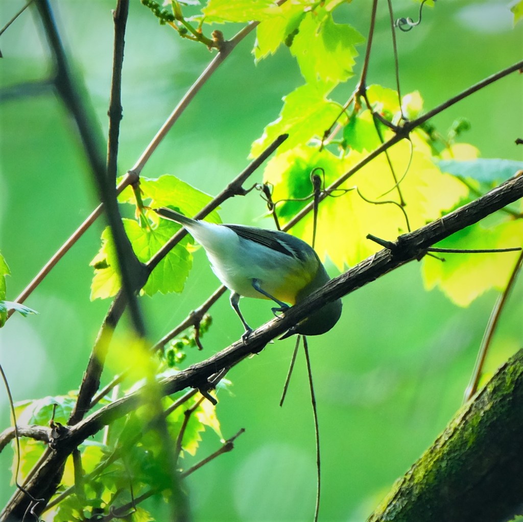I didn’t see anybody new at the pond, and on my way to the river, I spotted yet another new arrival, a yellow-throated vireo (Vireo flavifrons), just in from Central America and dispatching a pretty big bug, right behind the branch in the second image.