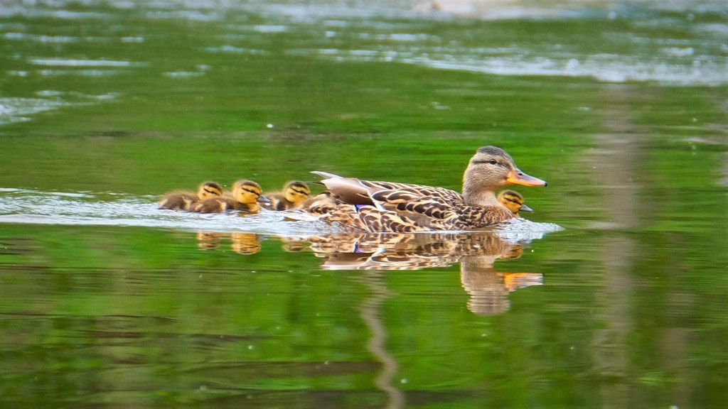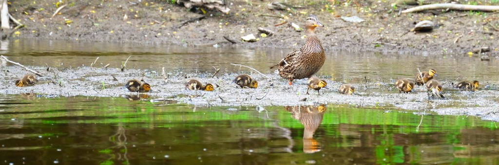 At the river I headed north and didn’t see anything noteworthy until I reached the north end, where lo and behold, look who is taking their maiden swim, as far as we know. If you’re not sure, yup, that’s a mallard hen with her ducklings, and we’ve seen plenty before, but not yet this season.