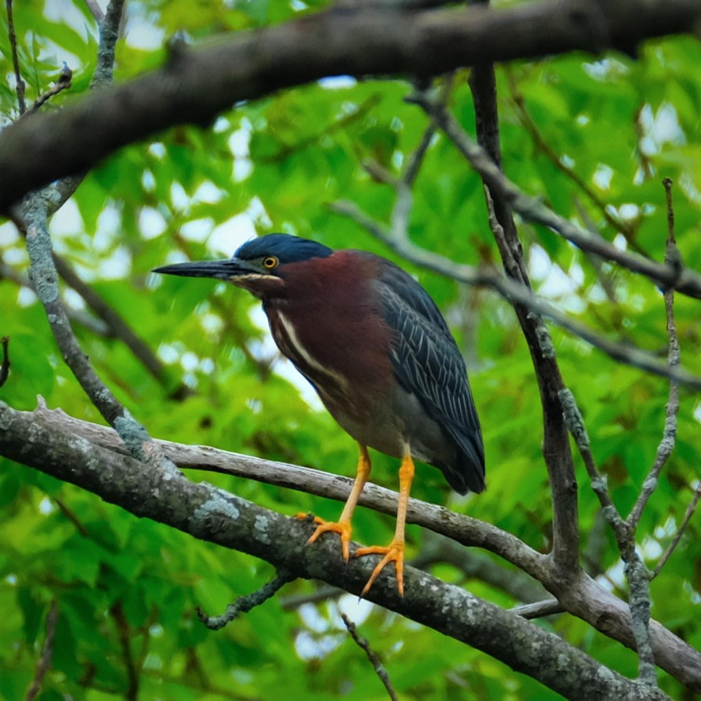 Continuing south, I head a green heron calling and finally spotted it up high up in a tree across the river absolutely rocking it’s Gru imitation.
